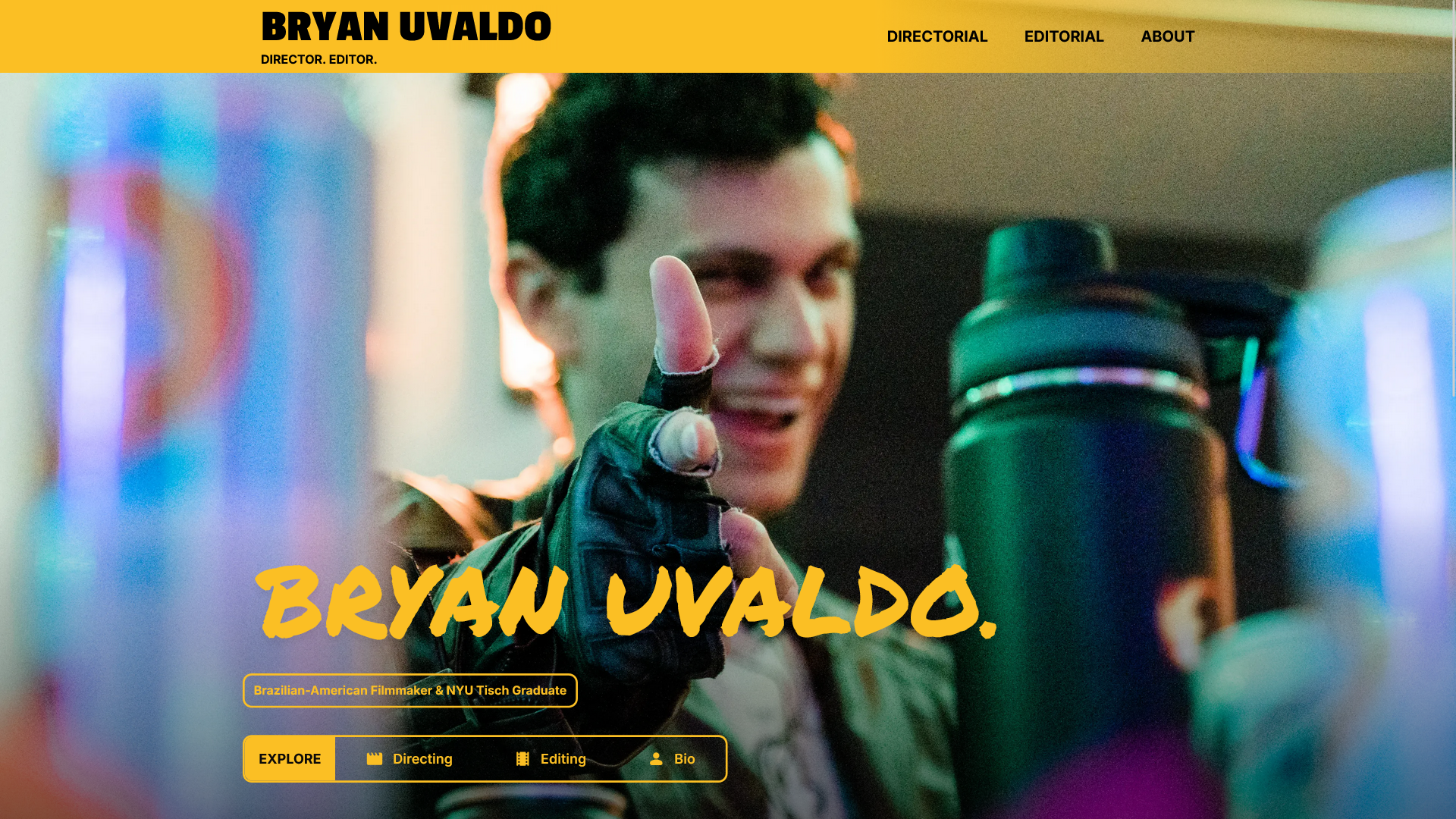 https://www.bryanuvaldo.com/ open_in_new This is a portfolio site I built for a friend of mine. It's a showcase of his film directing & editing experience, and includes a variety of custom components I designed to highlight his work.